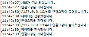 - 서버소켓 대기상태 (이유 : 클라이언트 프로그램의 연결요청을 처리할 수 있게 하기 위해)