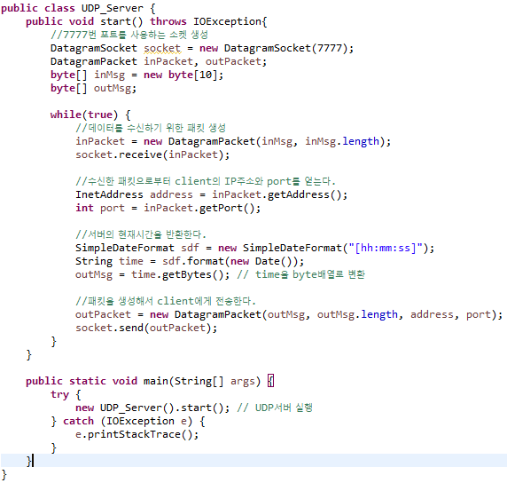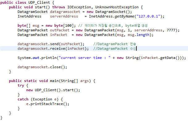 - 클라이언트가 DatagramPacket을 생성해서 DatagramSocket으로 서버에 전송하면
