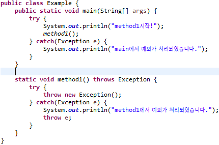 - 예외 처리 후 다시 예외 생성 -> 호출한 메서드로 전달