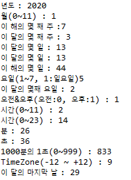 ** 월의 경우 0~11사이의 값이 출력된다. -> 0이면 1월, 11이면 12월을 뜻한다.