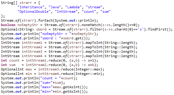 - ex2) Stream<String> strStream = Arrays.stream(new String[] {"a","b","c"});