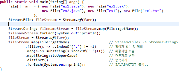| 스트림의 스트림 | 스트림 | flatMap() flatMapToInt() flatMapToLong() flatMapToDouble() |
